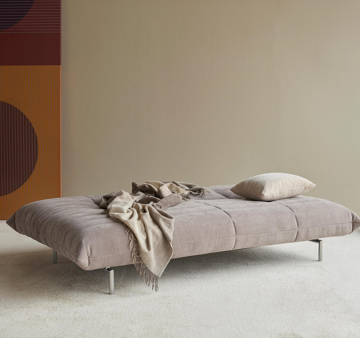 Das Mikunjo-Schlafsofa von Innovation Living ist eine moderne Kombination aus Design, inspiriert vom Stil der 1970er Jahre, Komfort und voller Funktionalität. Weiche Linien, gesteppte Polsterung und eine skulpturale Form verleihen ihm einen lässigen, leicht boho-Charakter, der perfekt in moderne Innenräume passt. Das Sofa wurde als modulares System konzipiert – es kann unabhängig oder in Kombination mit dem Mikunjo-Klappsessel funktionieren und so eine noch flexiblere und effektivere Entspannungszone schaffen.